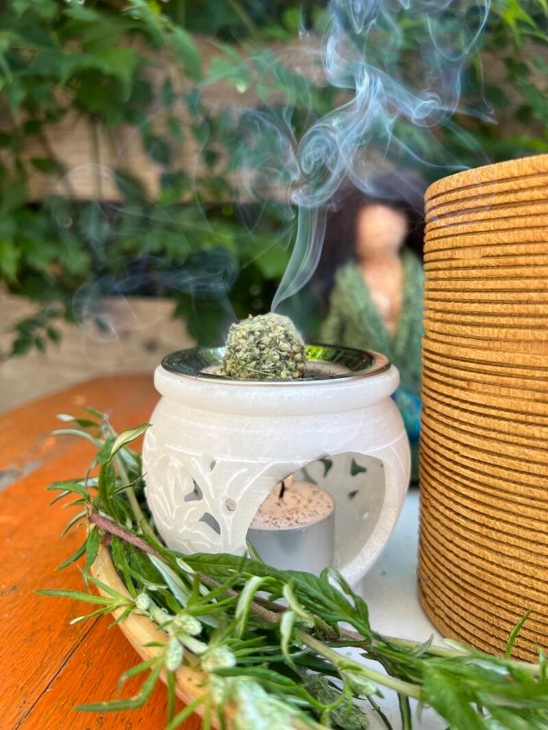 Je kunt de losse gedroogde kruiden branden op een kooltje in een vuurvaste schaal, of op een wierookbrander.