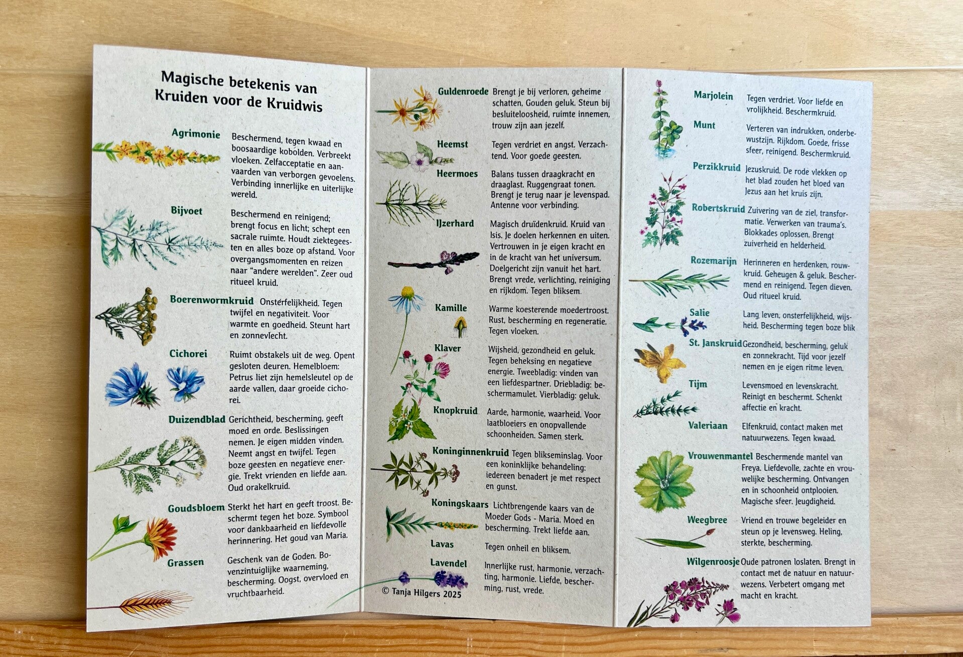 Handige opvouwbare overzichtskaart voor het maken van een magische kruidwis met midzomer of Maria Hemelvaart.