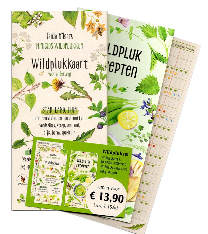 Wildplukkaart voor onderweg + Wildpluk receptenboekje + kaart wildplukkalender + postkaart met wildplukregels