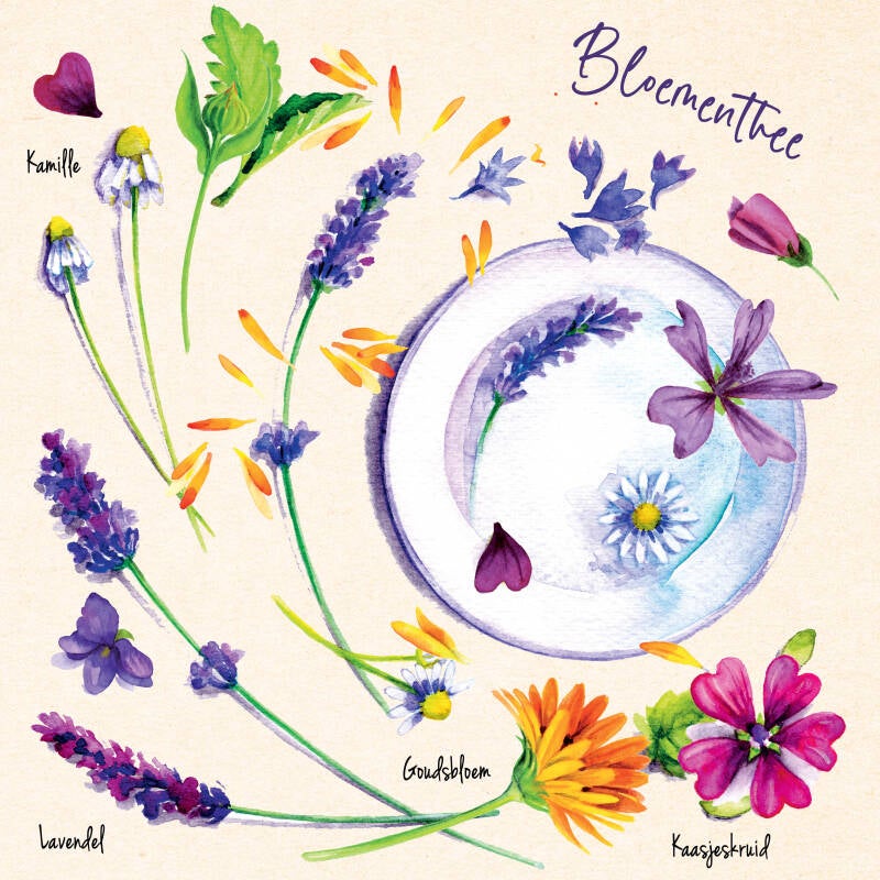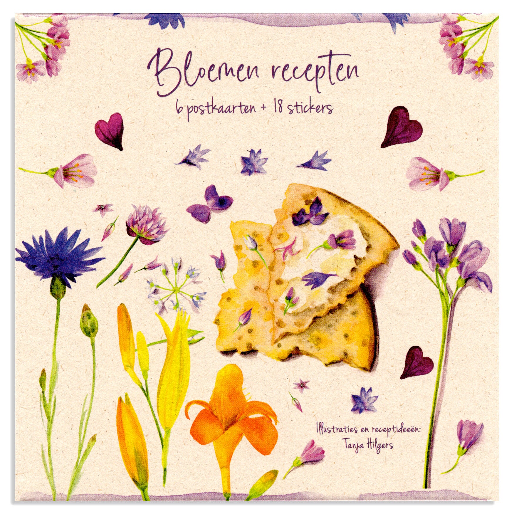 6 vierkante postkaarten met mooi geïllustreerde bloemen recepten + 18 leuke stickers