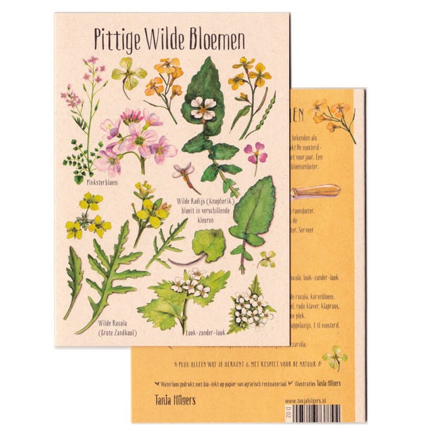 Op de voorkant staat een leuke illustratie van de wilde planten en ingrediënten voor het recept. Op de achterkant staat het hele recept.