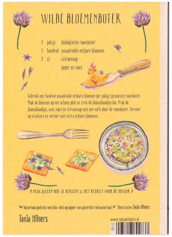 Op de voorkant staat een leuke illustratie van de wilde planten en ingrediënten voor het recept. Op de achterkant staat het hele recept.